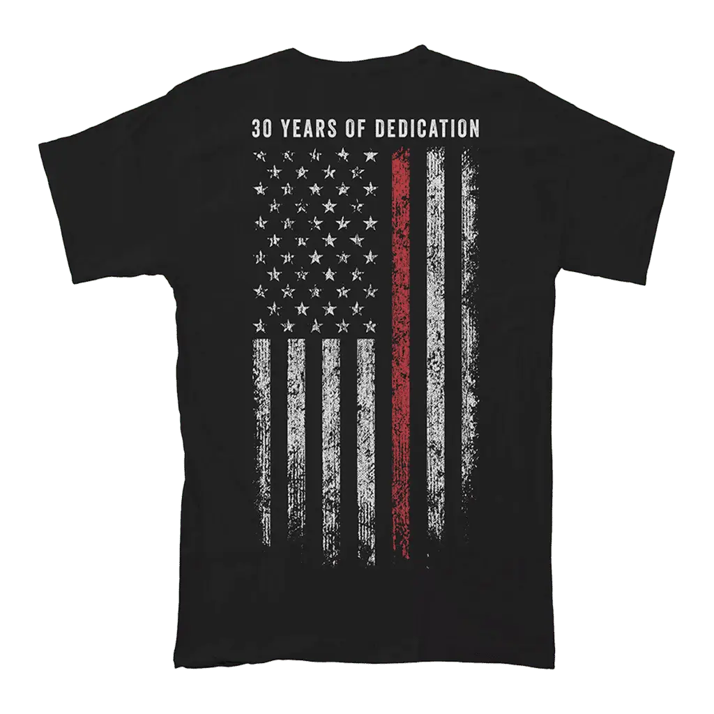 BME 30 Year Anniversary T-shirt with the Thin Red Line Flag.
