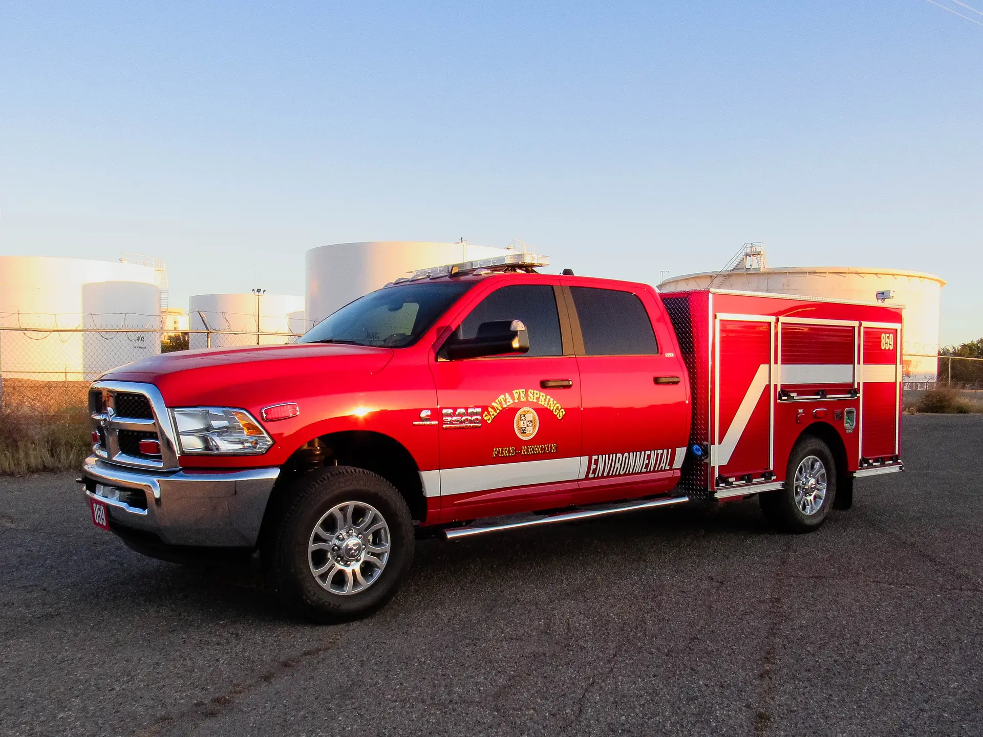 Santa Fe Springs came to us with a unique request for a dual function squad unit; this concept is different than most of our trucks but we were able to completely customize this vehicle to meet the customers needs. This rescue unit was designed to be used for environmental incidents and medical rescues. Built on a Dodge 3500 with a Cummins 350 HP Diesel engine, this unit is functional and efficient. This unit will be used for hazardous situations a few times a month. It will also be called out to investigations, inspections and follow-ups. Santa Fe Spring’s previous environmental response unit lacked protection of hazardous waste materials during transport, installing a ROM Roll-Up Door was a the solution. The bullet lined bed of the truck is designed to safely carry 55 gallon drums. The back of this unit also features a swing-out sampling system with test tubes, clean-up kits, spill kits, and an in-cab refrigerator to keep samples cool on the way to the lab. Although this truck is primarily used for environmental response, it was important for Santa Fe Springs to have the dual functionality of a rescue as well. This rig is equipped with Code 3 running equipment, ability to transmit out, and a hearing system outfitted for paramedic use. This vehicle has 6 compartments in the body with roll up doors, LED strip lighting, adjustable shelves, and dual slide outs for easy access to equipment.